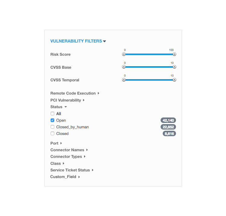 The options included in the checkboxes are the “most commonly used” but only a small selection of the real power of the Cisco Vulnerability Management platform. Many more filter criteria are available using the Custom Query String search function which is based upon Lucene search expressions.